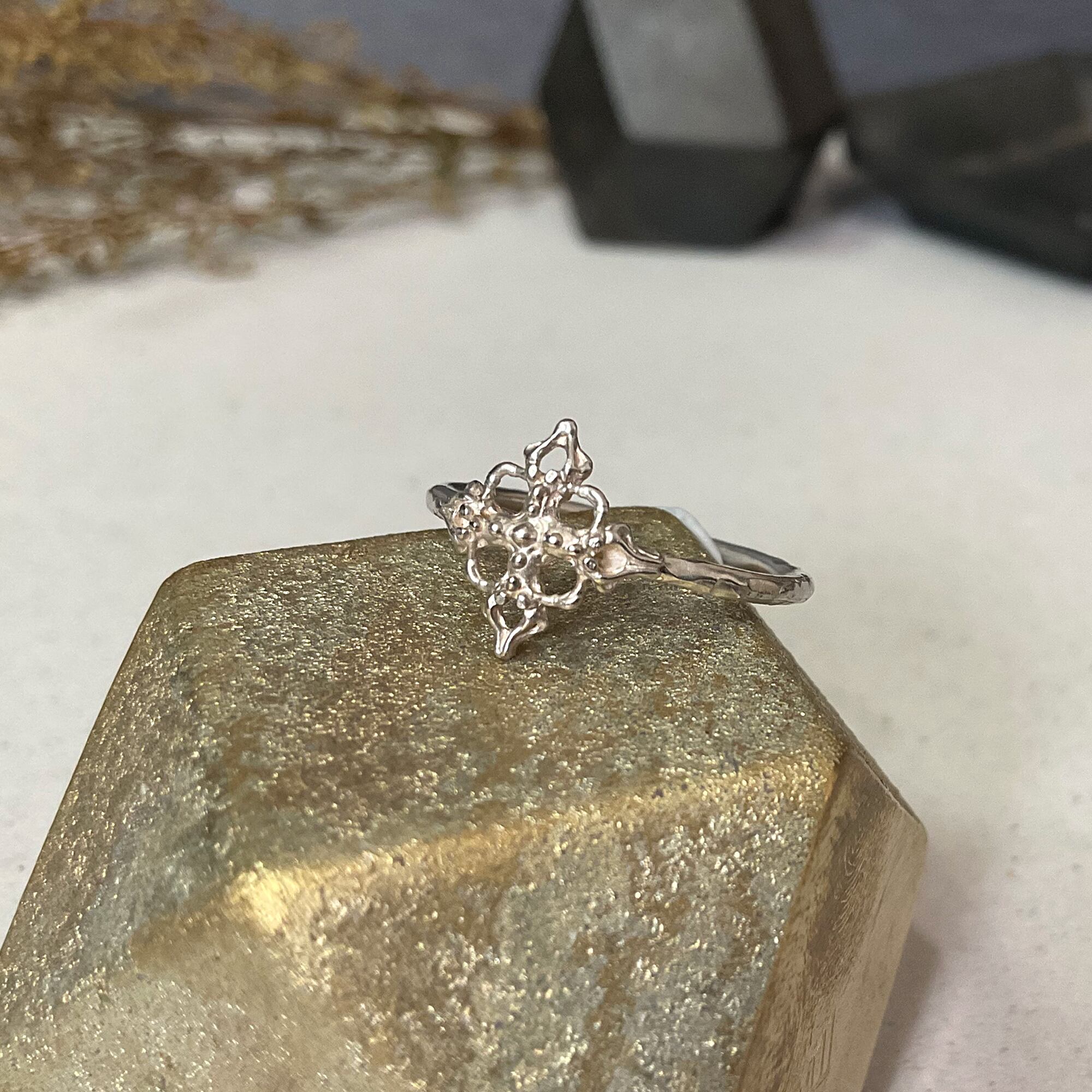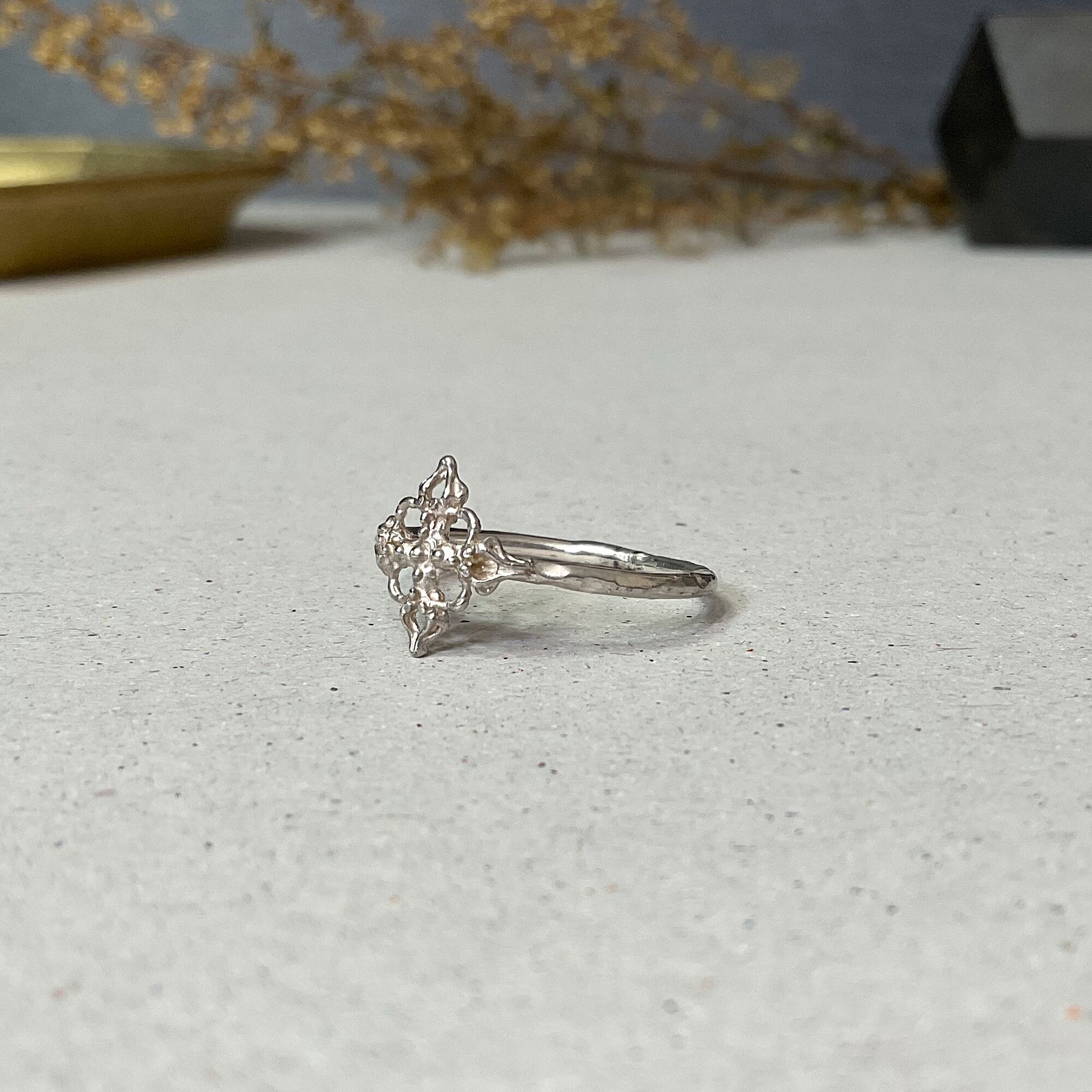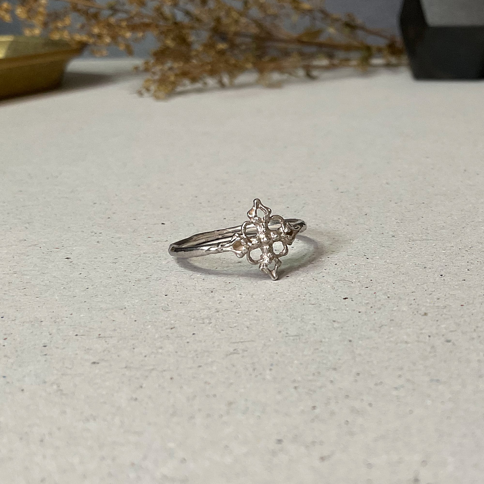 クロスや雪の結晶の様にも見える造形が魅力のリングです。